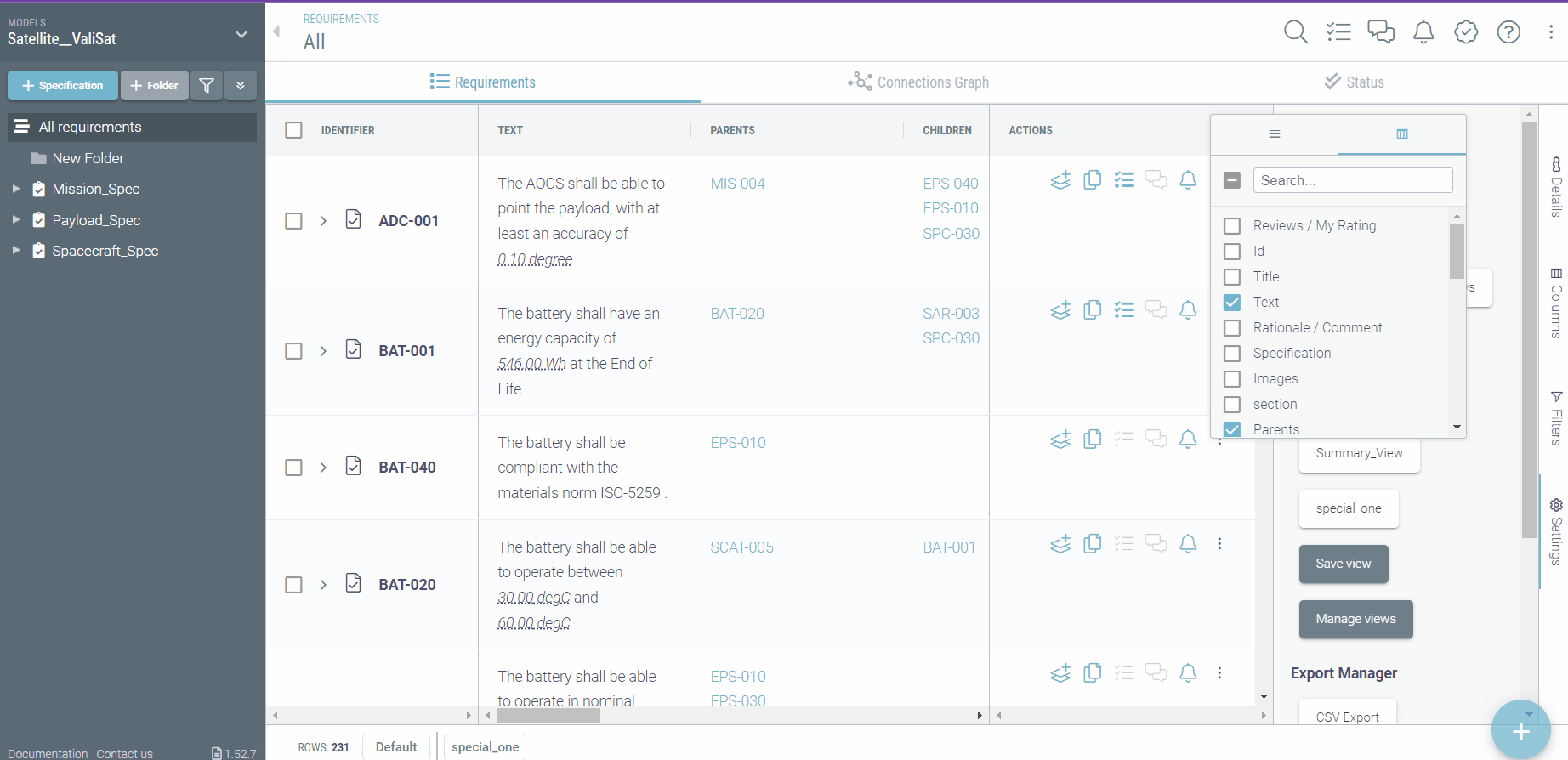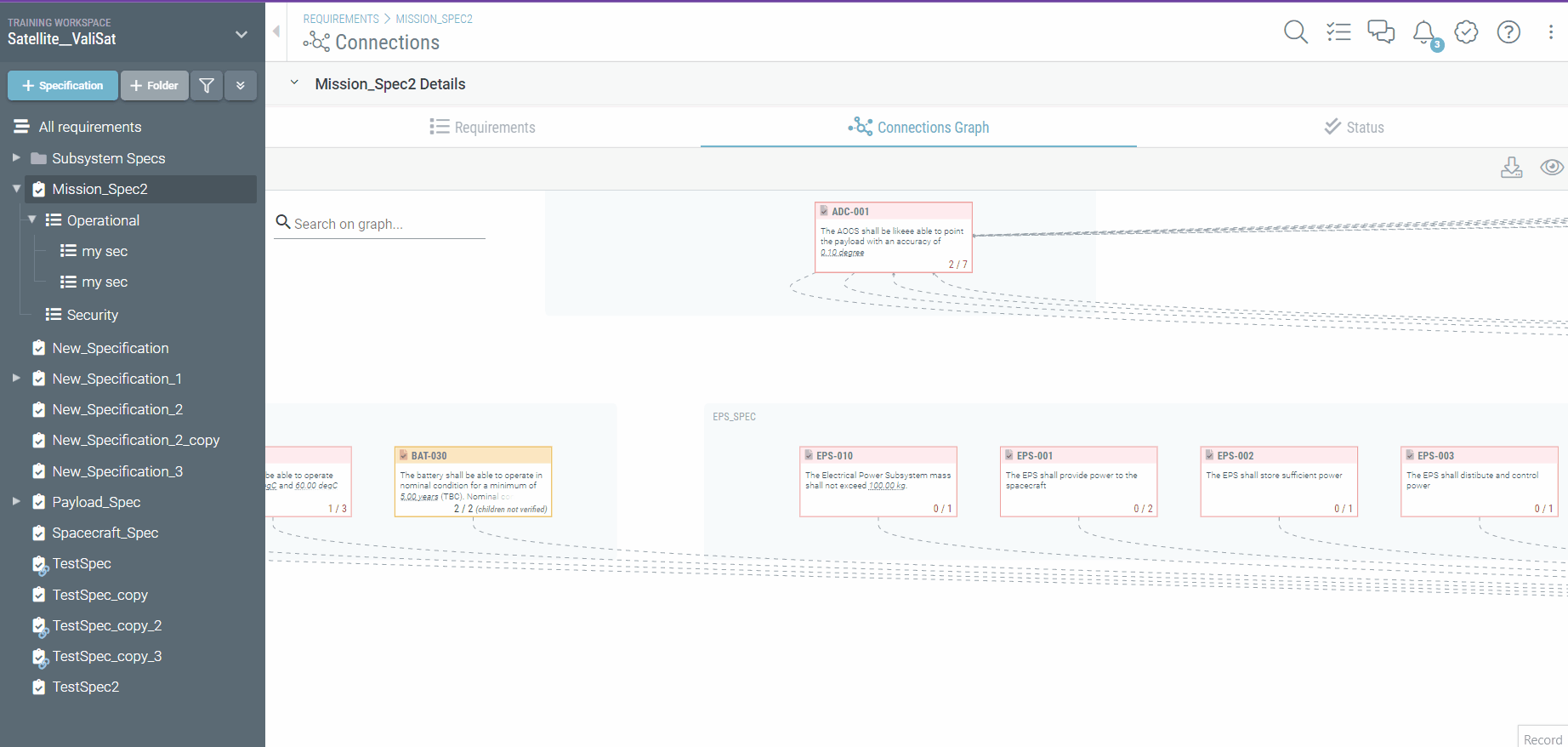 The current version of Valispace includes a create button for each requirement in the connections diagram to assign a new parent or a new child requirement to a particular requirement. The button is visible once the user clicks on the target requirement. Once the user clicks on the button, a pop-up of the regular requirements connection view appears with a section to choose the relationship.