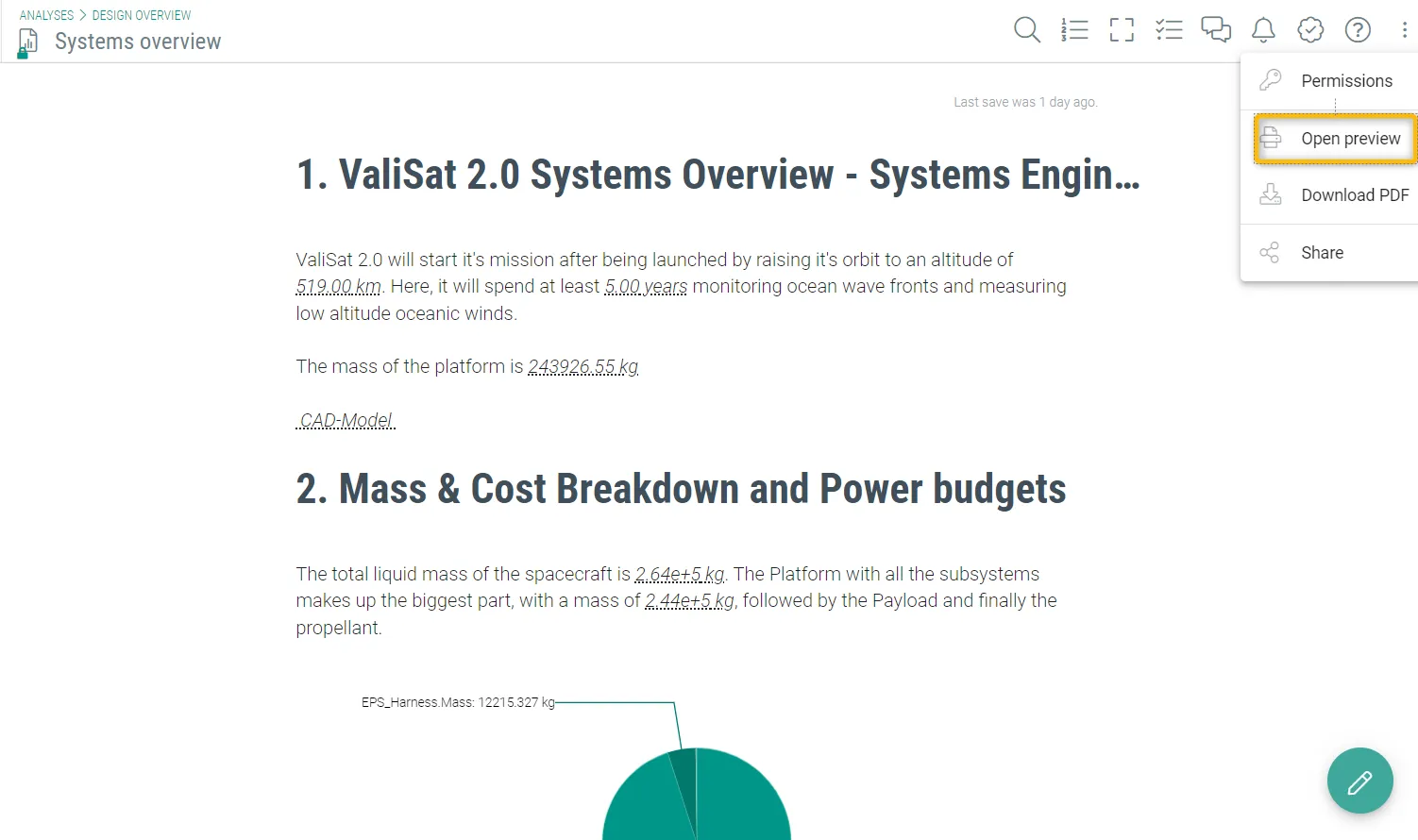 The latest version of Valispace provides an option “Open preview” in the analysis context menu (the three dots in analysis detail) and also on the shared analysis page that allows the user to open that analysis in the print preview (pdf) mode. The users can use the chrome option to print by right-clicking or ctrl P to save as pdf or download pdf.