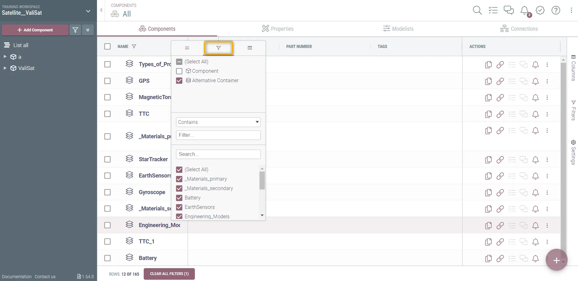 This new feature allows user to filter within the components table to filter between alternative containers and various components. To use the filter option, click on the three dashes on the right side of the component’s ‘Name’ column, then appears the filter icon as shown in the below image. Here you can filter for the alternatives, components and also using keywords criteria.