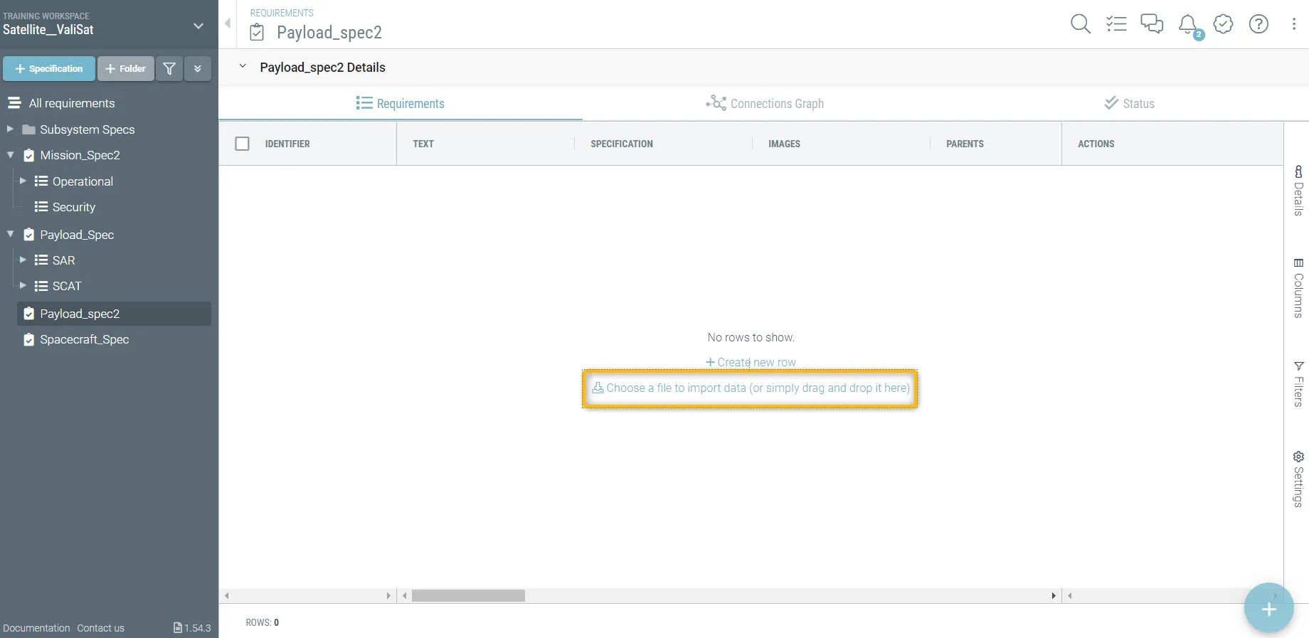 In the latest version of Valispace, the user has an option to directly import the data for the requirements table from external files on a blank specification page. The user can find the ‘Choose a file to import data’ link in the middle of the blank specification page as shown in the image below.