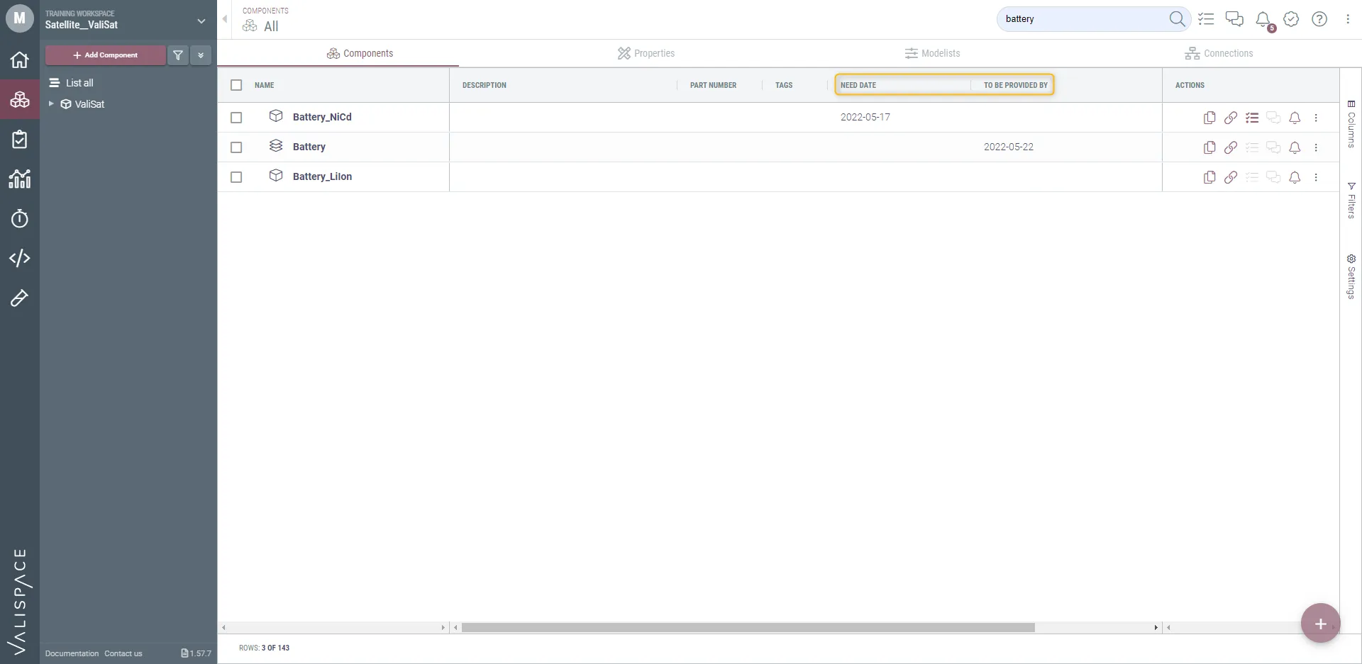 Two new columns were added to the components table. Now, the user can quickly look at the ‘Need date’ and ‘To be provided by’ information by adding the columns to its table. When creating task connections with components, the data is automatically added to the columns. Therefore, the user knows when the component/valis is needed and will be provided.