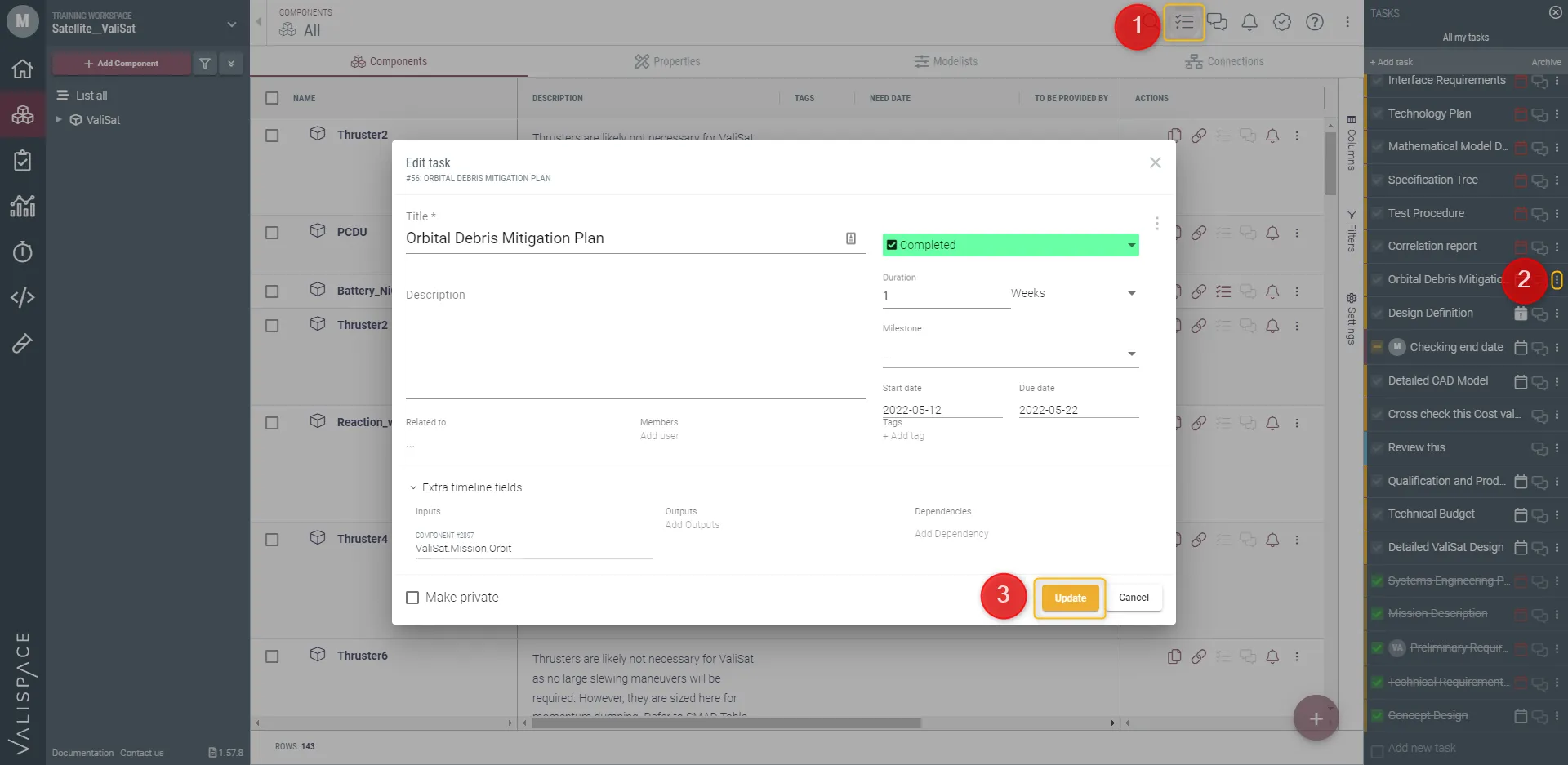 To see all the information on one task, go to the tasks icon on top of the screen (1). In the ‘All my tasks’ column, look for the task and click on the three dots icon (2). A new window appears with all the information related to the task. There, you can edit its status (to do, started, completed) but also its duration and check its components' connections. To save your modifications, click on update (3).