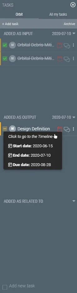 In the column of the tasks, the user can find the tasks they previously added to the components/properties. There, it is easy to see the status of the tasks related to that object: green check if completed, orange hyphen if started, grey check if to be done. Also, by hovering over the calendar icon, the user can check the start, end, and due date of the task without having to go to the timeline.