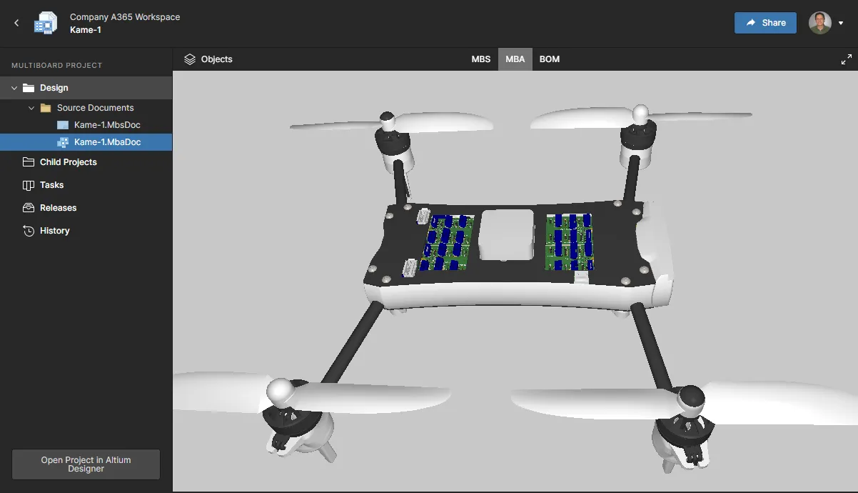 The Workspace provides an advanced, manufacturing-oriented CAD-centric view of the project. This management interface offers Design, Tasks, and History views options, plus more: