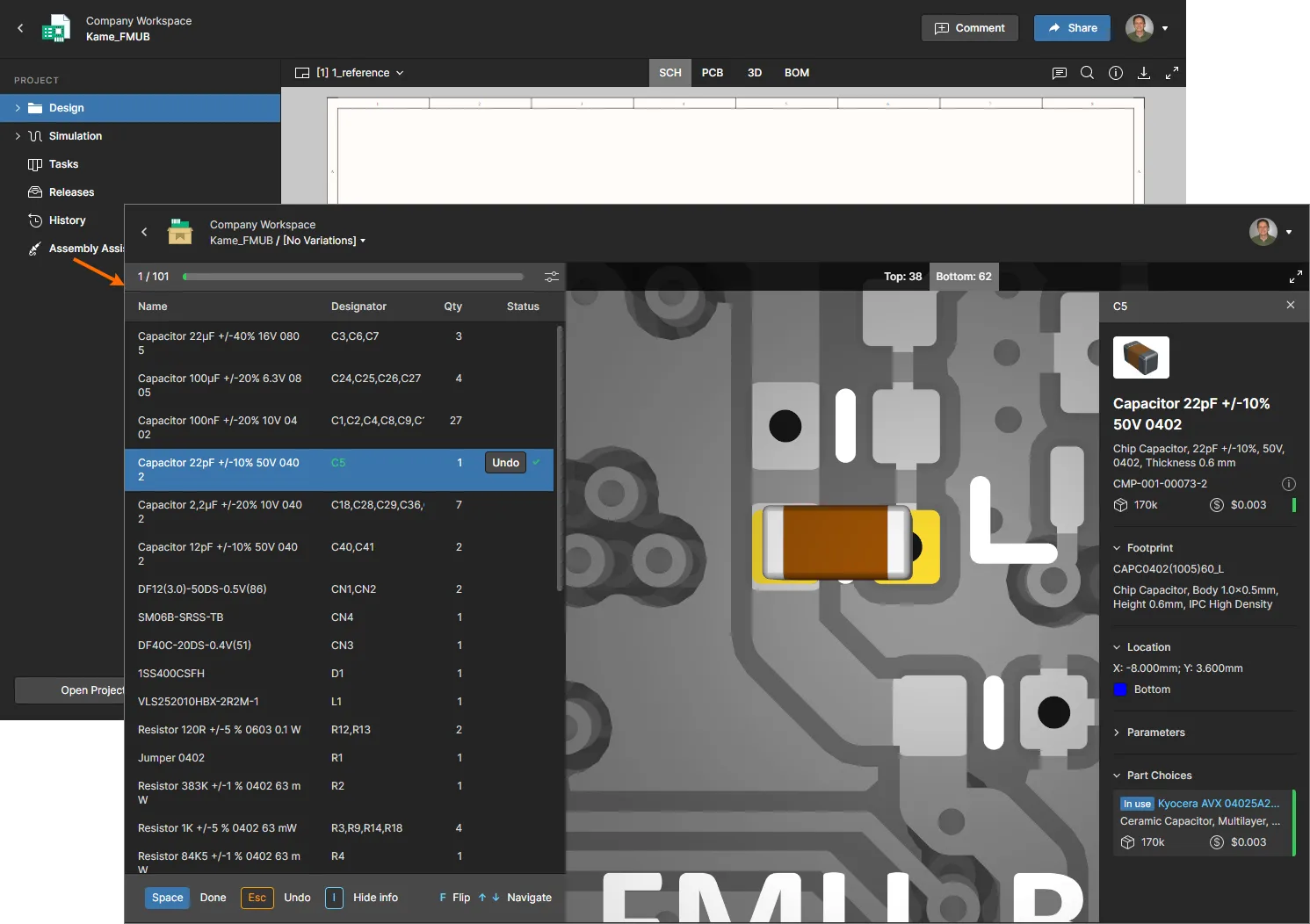 The Assembly Assistant opens in its free browsing mode and is switched to the formalized Assembly process mode from the button – see Assembly Process Flow for more information. This mode invokes an interactive step-through process that allows you to mark off BOM entries as Done or Skipped as you move through the physical board assembly. The PCB graphics will zoom to the related component part and flip the board view as required.