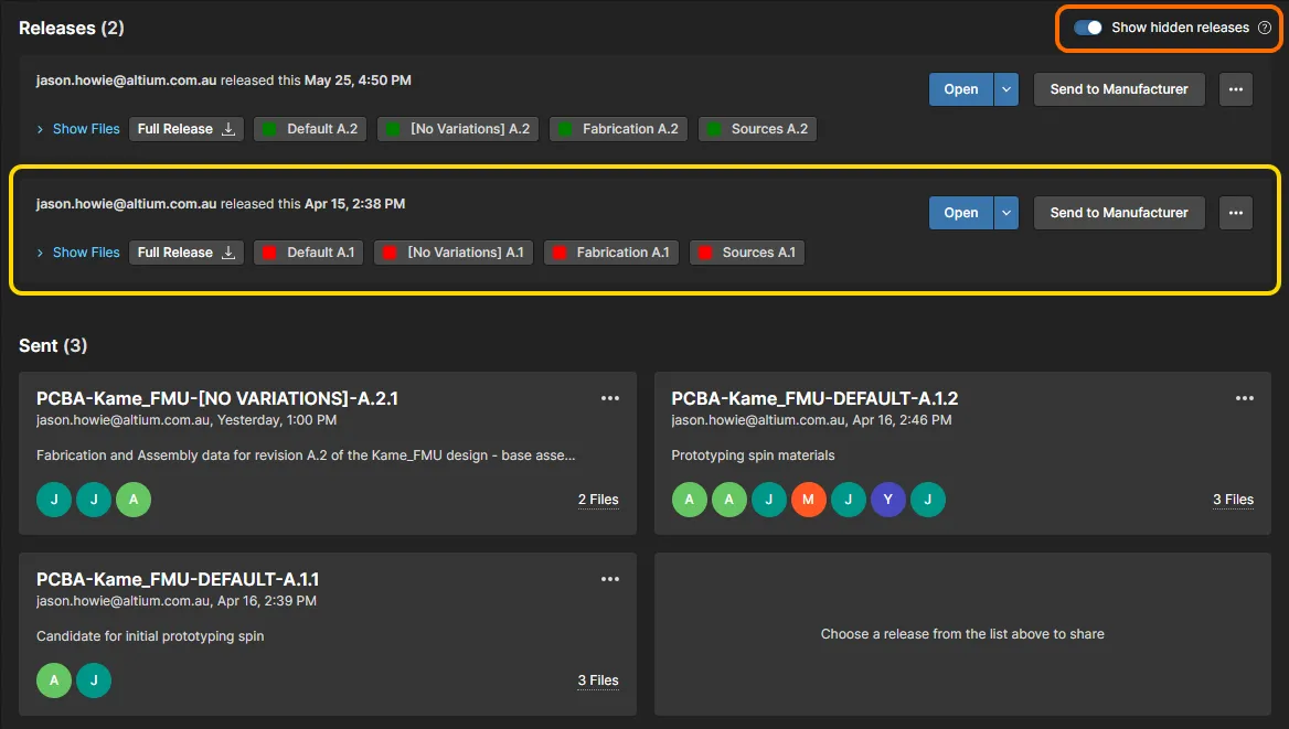 The Releases view presents all project release packages that have been generated from the design space (see Design Project Release), where each package incorporates the released Source, Fabrication and Assembly data.