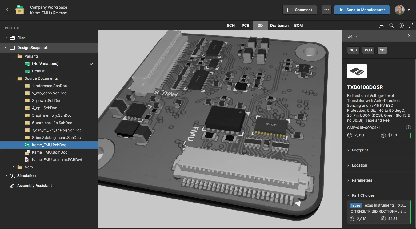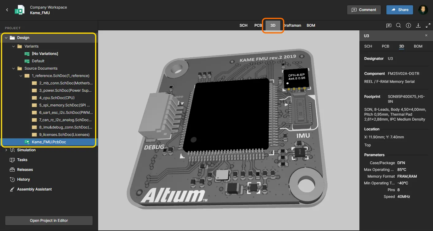 The Design view utilizes Altium 365's Web Viewer functionality to provide an immersive and interactive experience for reviewing the source schematic and PCB documents in your design project. Shown here is a schematic followed by the PCB in 3D.