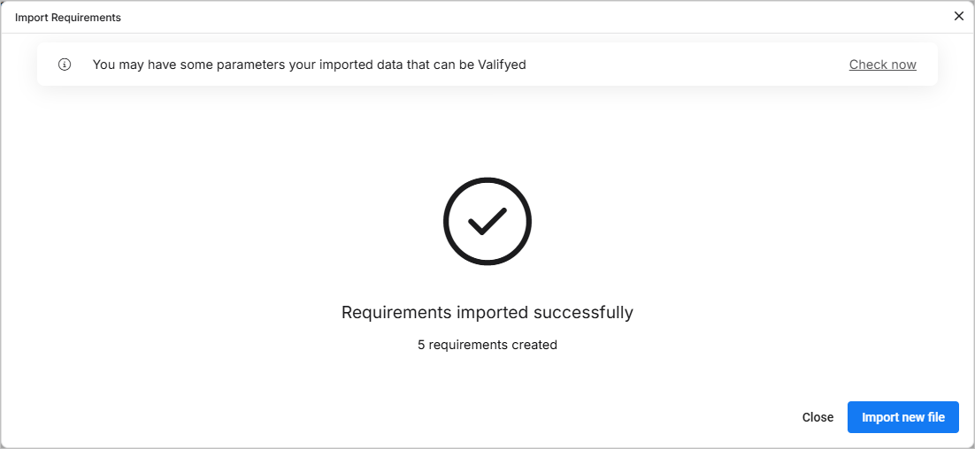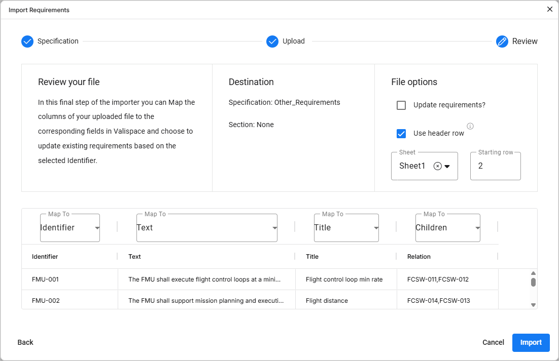 When accessing the Importer (learn more), you can choose to continue with the legacy import tool to upload structured requirements data. The process guides you through three main stages: Specification, Upload, and Review. On completing a specification import, a summary is presented as well as the possibility to perform additional actions such as Valifying or importing other files. These stages and actions are described in the sections below.
