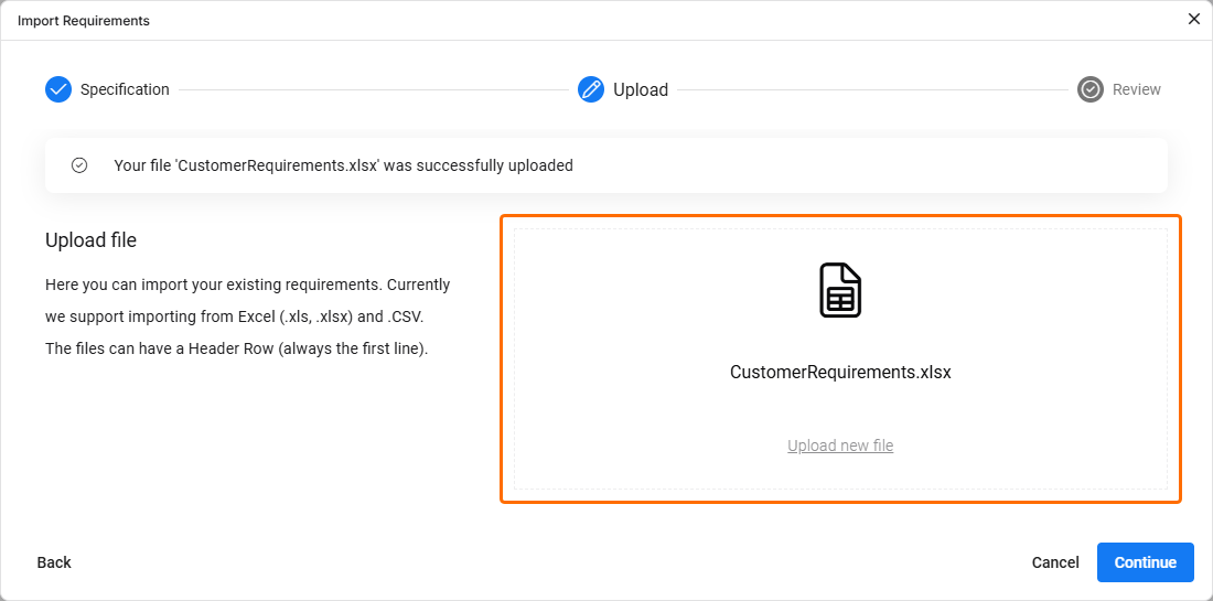 Use header row – you can decide to use the header row of the uploaded file or to use a general reference header row provided by Requirements Portal (i.e., columns headers as A, B, C, etc.).