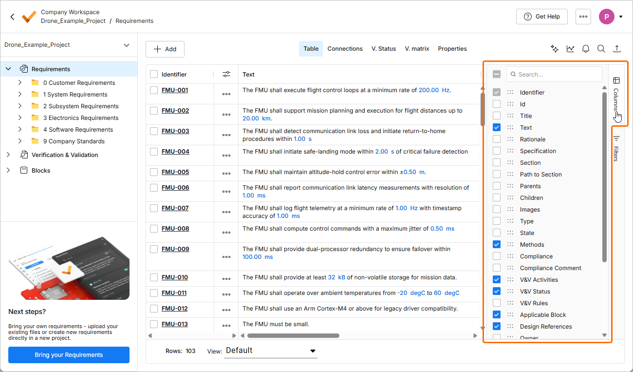 The Requirements Module has different columns for every Requirement Field, each with its characteristics. However, if a field is unavailable for your use case, you can create a custom column in the custom columns page within the settings. The visibility of columns can be configured using the Columns pane, as shown below.