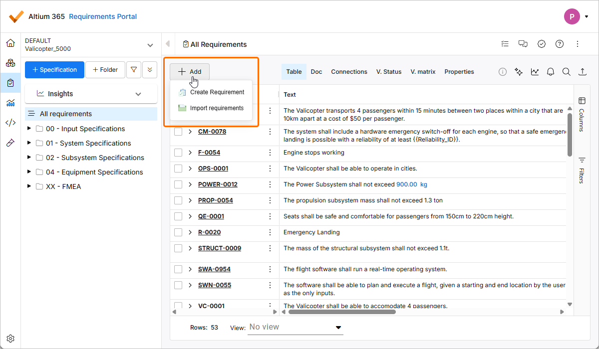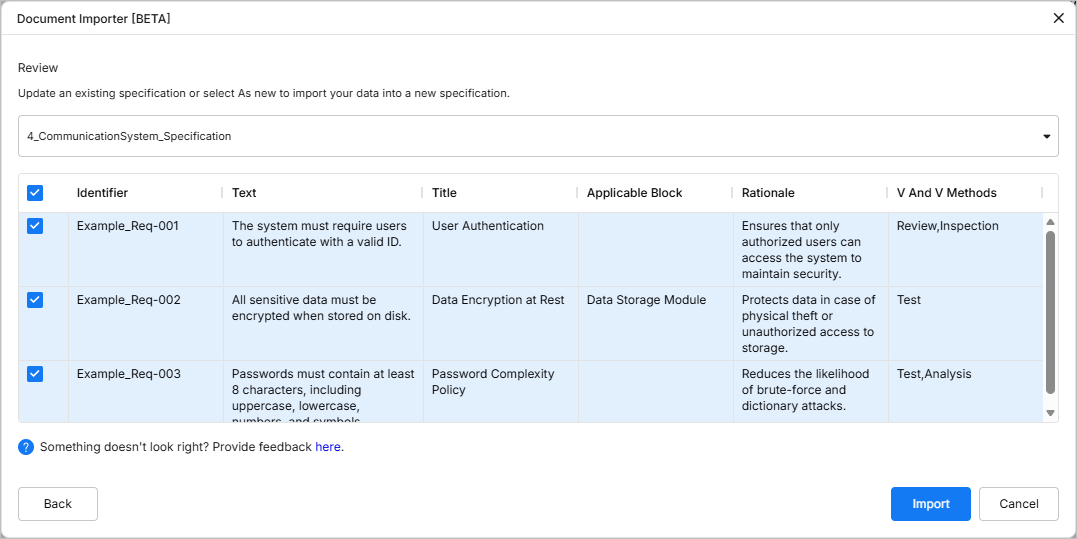 • Requirements engineering often begins with drafting of stakeholder requirements in documents like PDFs and Excel spreadsheets where data is not well structured. Extracting requirement data manually from these unstructured documents might be labor-intensive and error-prone, and in order to expedite the process of capturing requirements in Requirements Portal, you can leverage AI capabilities to import requirements from unstructured PDF, Excel, Word, and CSV files using a new AI-assisted Importer.