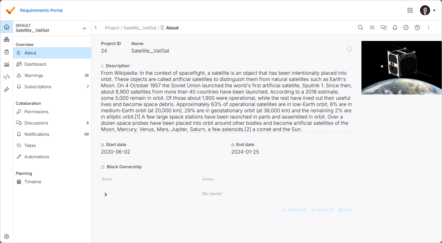 From the About page of the Project Module, you can change main properties of a requirements project. When in the Project Module (