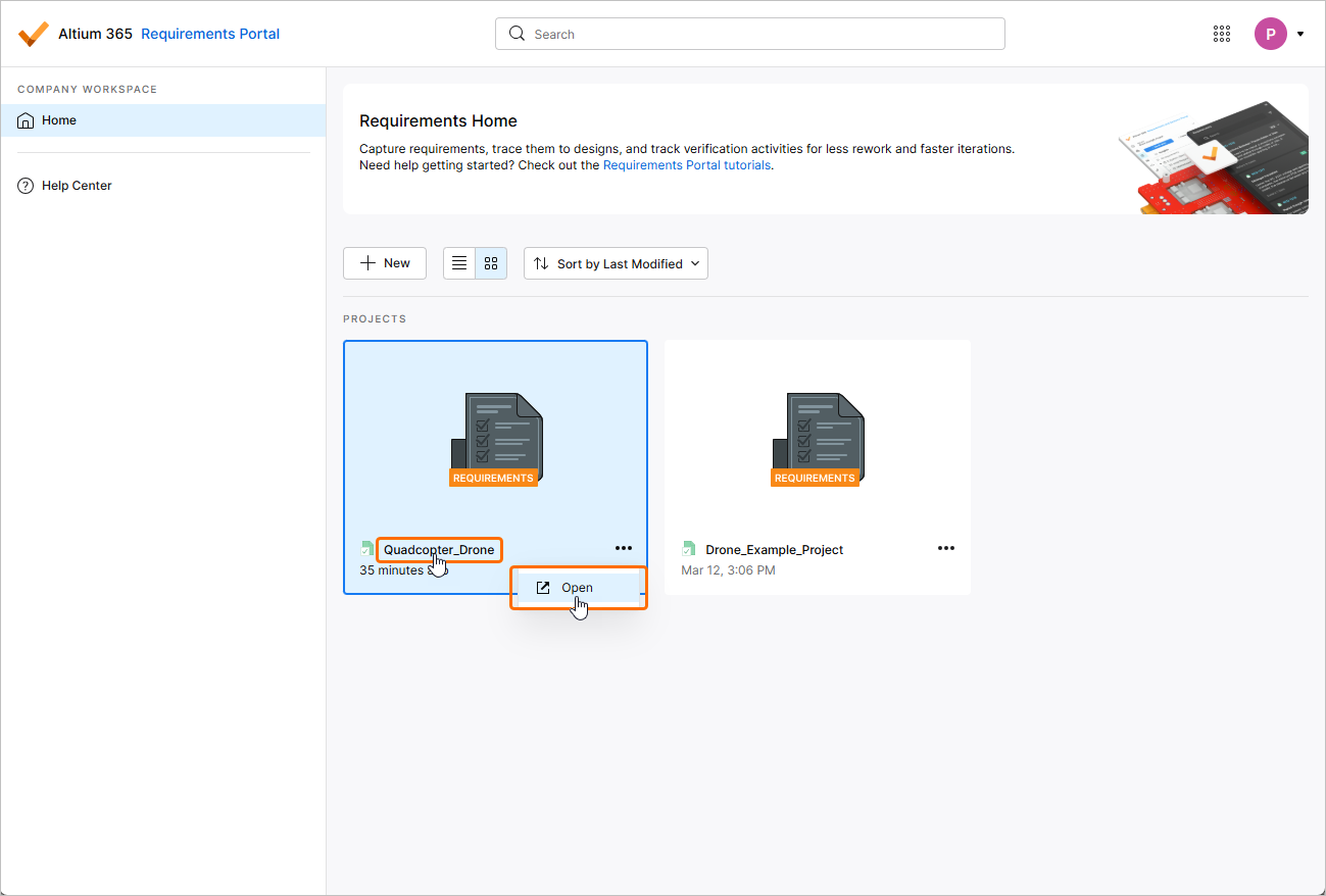 control in the tile for the required requirements project and choose the Open command from the menu that appears. Alternatively, click on the project's name within the tile or double-click the tile.