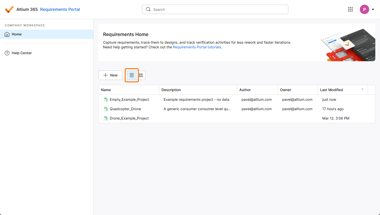 A requirements project can be accessed from either the list or graphical view of Requirements & Systems Portal's Home page.