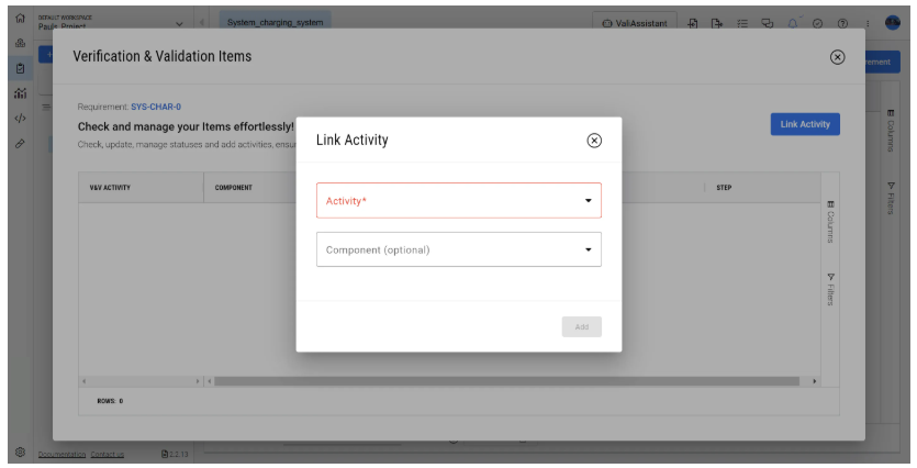 For this you can double click on a cell in the “V&V Activities” Column in the Requirements Module and create an Activity.
