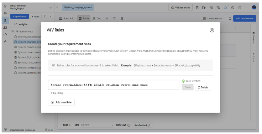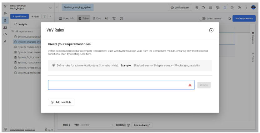 For this, make sure you have established Valis on both sides (in the System Design Module and in the Requirements Module). To establish a Rule, double-click a cell in the “V&V Rules“ column on a Requirement.