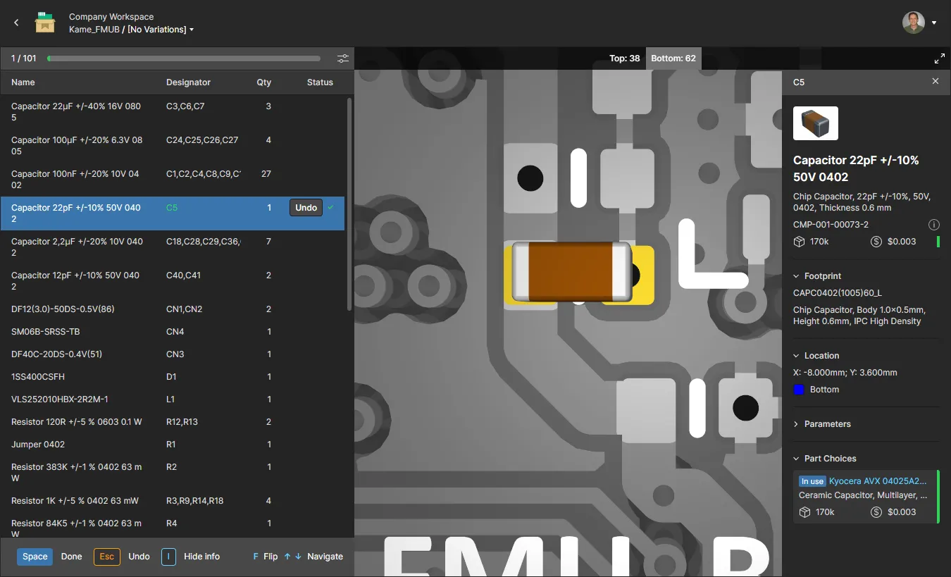 • Assembly Assistant – work with the interactive Assembly Assistant tool to check and progress through the board assembly process. The tool brings together the project's detailed BOM data and its 2D/3D assembly view to present an interface that provides the required set of graphical and component part information for stepping through the assembly process. See the Assembly Assistant page for more information.