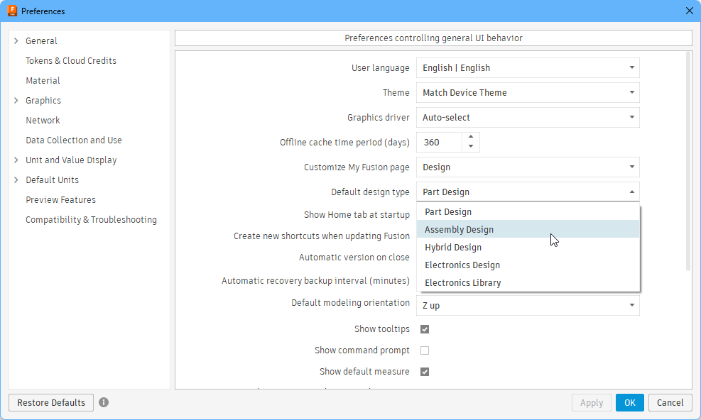 To disable this automatic grounding behavior, uncheck the First component grounded to parent option in the General – Design – Assemblies page of the Fusion Preferences dialog.
