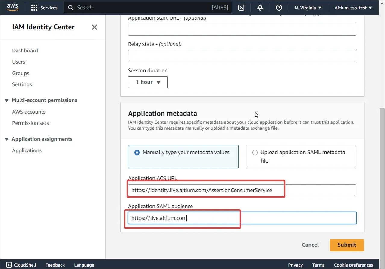 ) the Entity ID and Single Sign On URL entries from the Altium Sign-On Settings section of the Company Dashboard Authentication page and paste them into the AWS metadata URL settings. Confirm the settings with Submit.