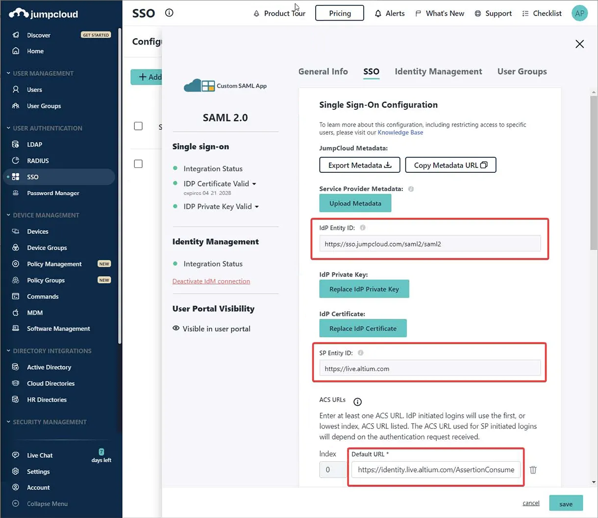 Note that the Altium metadata configuration entry includes provided identity information for your organization’s Altium SSO service: