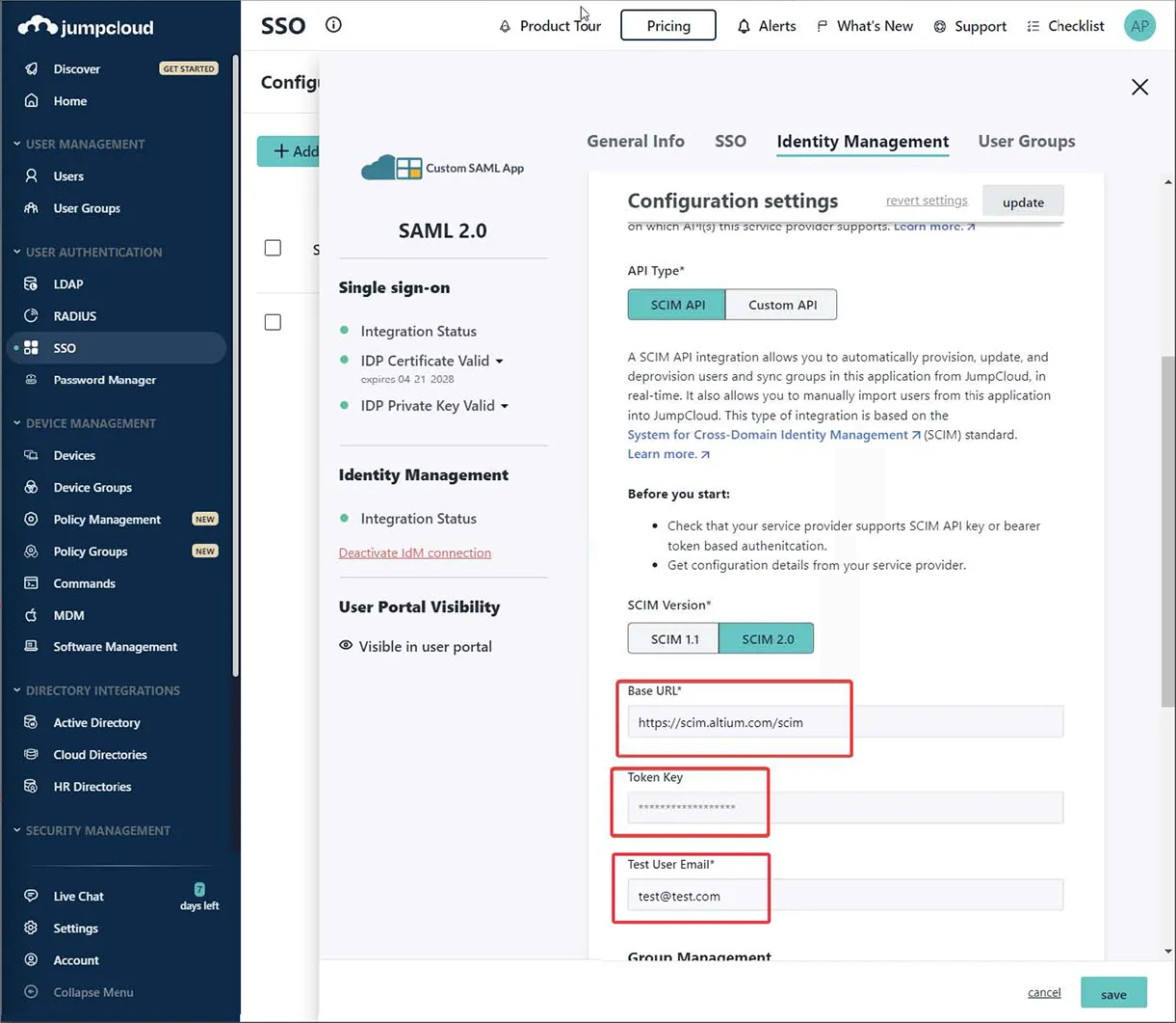 Enable the Create Users, Update User Attributes, and Deactivate Users options, and then click Save.