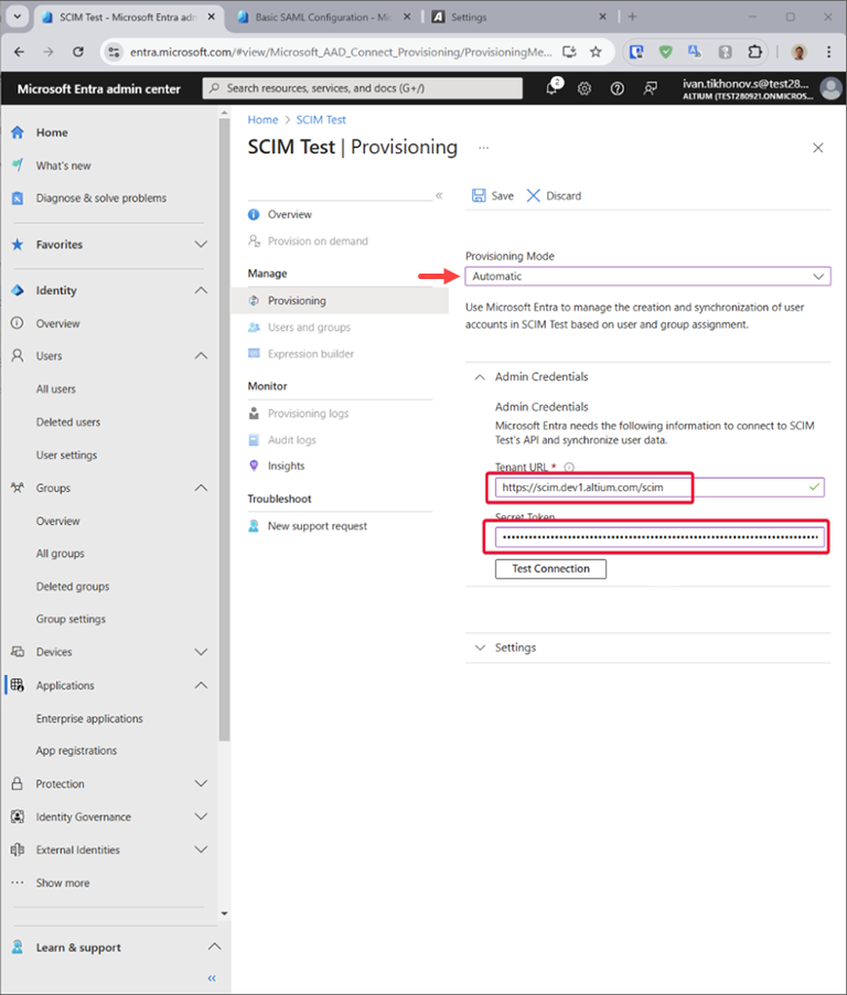 Note that the user Provisioning section is preconfigured with Altium's SCIM settings in order to support User/Group provisioning through your company's Identity Provider (IdP), such as Okta, OneLogin, etc.