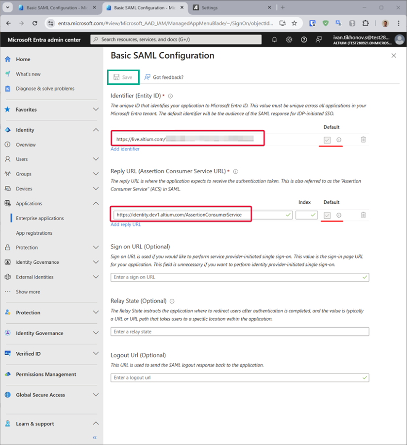 In the Identity Provider’s application management interface, change the application's Entity ID reference – typically called a variation of 'Audience' or 'Entity'– to the new extended version copied from the Altium Dashboard. Save the settings.