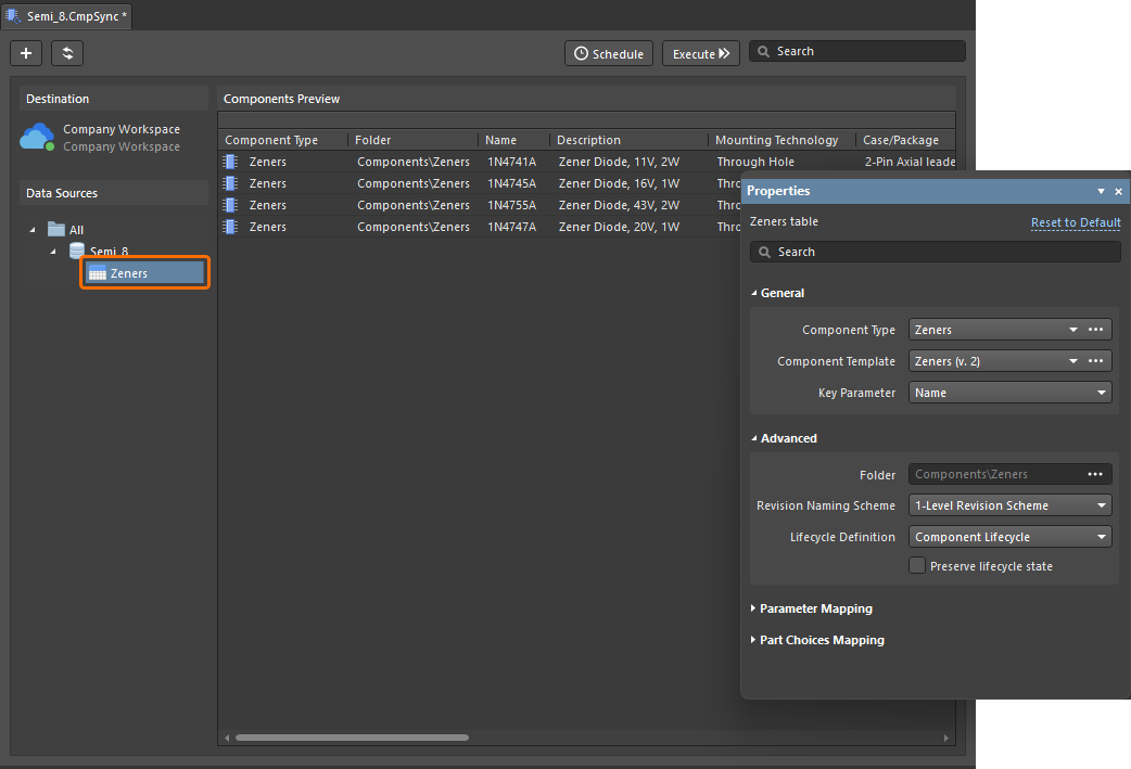 In this example the component type (Zeners) has been identified and its Component Template applied. The template then determines the target Workspace folder, component Naming Scheme and applied Lifecycle definition. Component entries are matched to source Database entries using a unique identifier, as specified by the Key Parameter entry in the Properties panel – in this case Part Number is used, although Name or even Description would be equally effective.