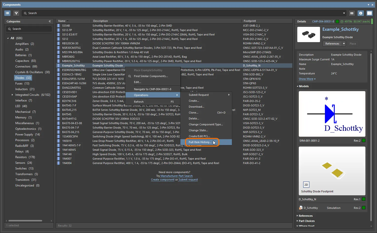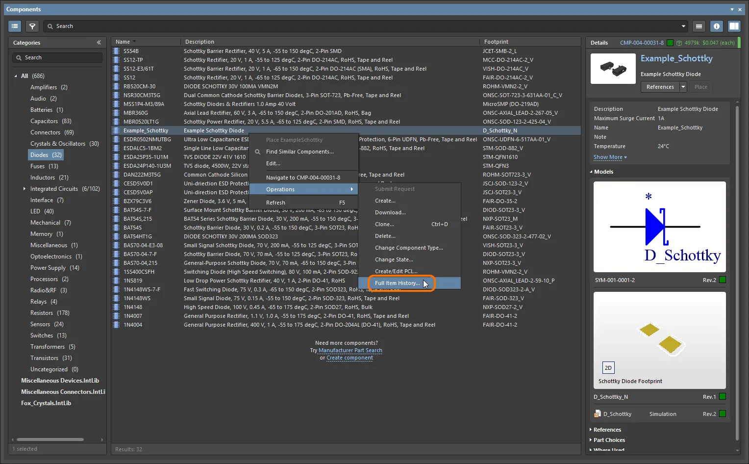 When working with components, in particular, you can also access the detailed Item view from the Components panel. Browse to the component of interest, then right-click and choose the Operations » Full Item History command from the context menu.