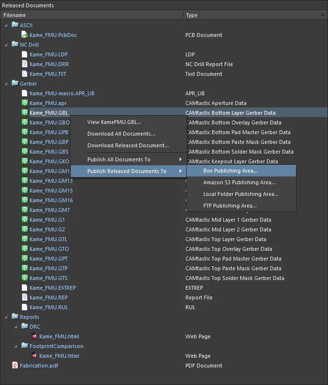 From within the Item view, you have the ability to publish released documents for any revision of a PCB Fabrication Data Item, PCB Assembly Data Item, or PCB Project Design Item, to any hosted storage space defined within your Publishing Destination preferences. Currently supported hosting destinations include Box.com, Amazon S3, an FTP server, or a simple folder location on a shared network. In terms of distribution and collaboration, this provides an unparalleled advantage in a world where the collective members of the overall 'product team' – the design team, the manufacturing team, and all others involved in the process of getting a product from thought to reality – are often dispersed around the globe.