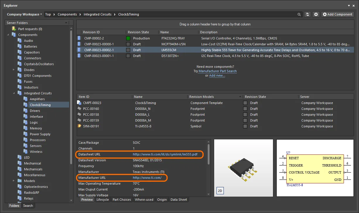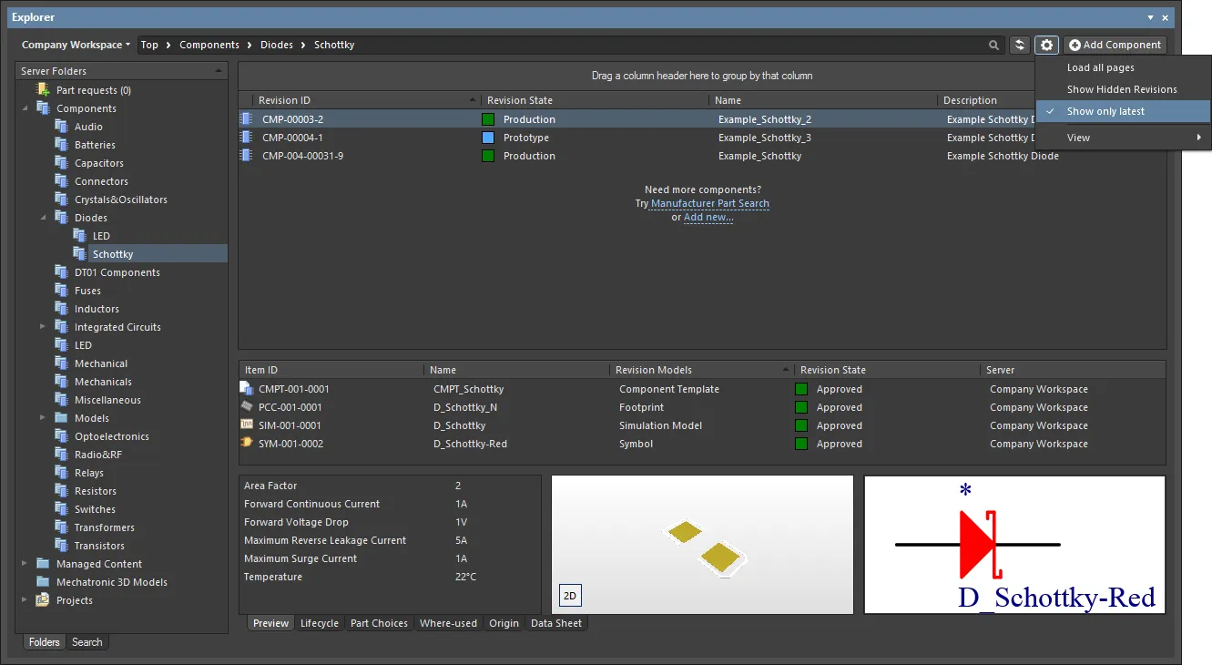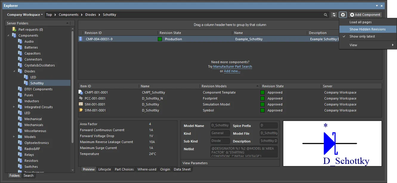 You also will come across various places that offer the ability to access the Explorer panel directly for a given Item through an associated Show in Explorer or Show in Server command. For example, right-click over a Workspace library component placed in a schematic or PCB document and choose the Part Actions » Show <ItemID-RevisionID> [<ItemName>] in Server or Component Actions » Show <ItemID-RevisionID> [<ItemName>] in Server command, respectively, from the context menu, to open the Explorer panel with the specific revision of the corresponding Component Item selected/presented.