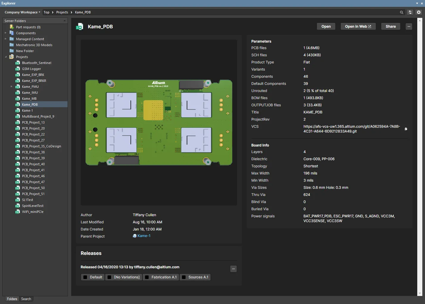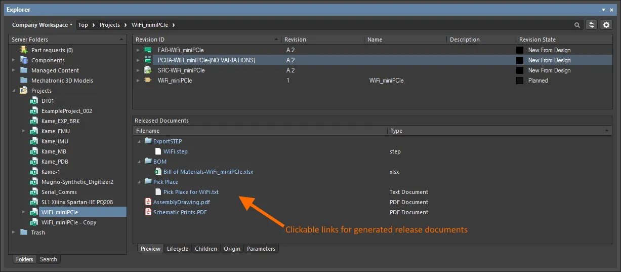 • Clicking on a document in the Released Documents region – from the Preview aspect view tab for a revision of a PCB Fabrication Data Item, PCB Assembly Data Item, or PCB Project Design Item – to open that document.