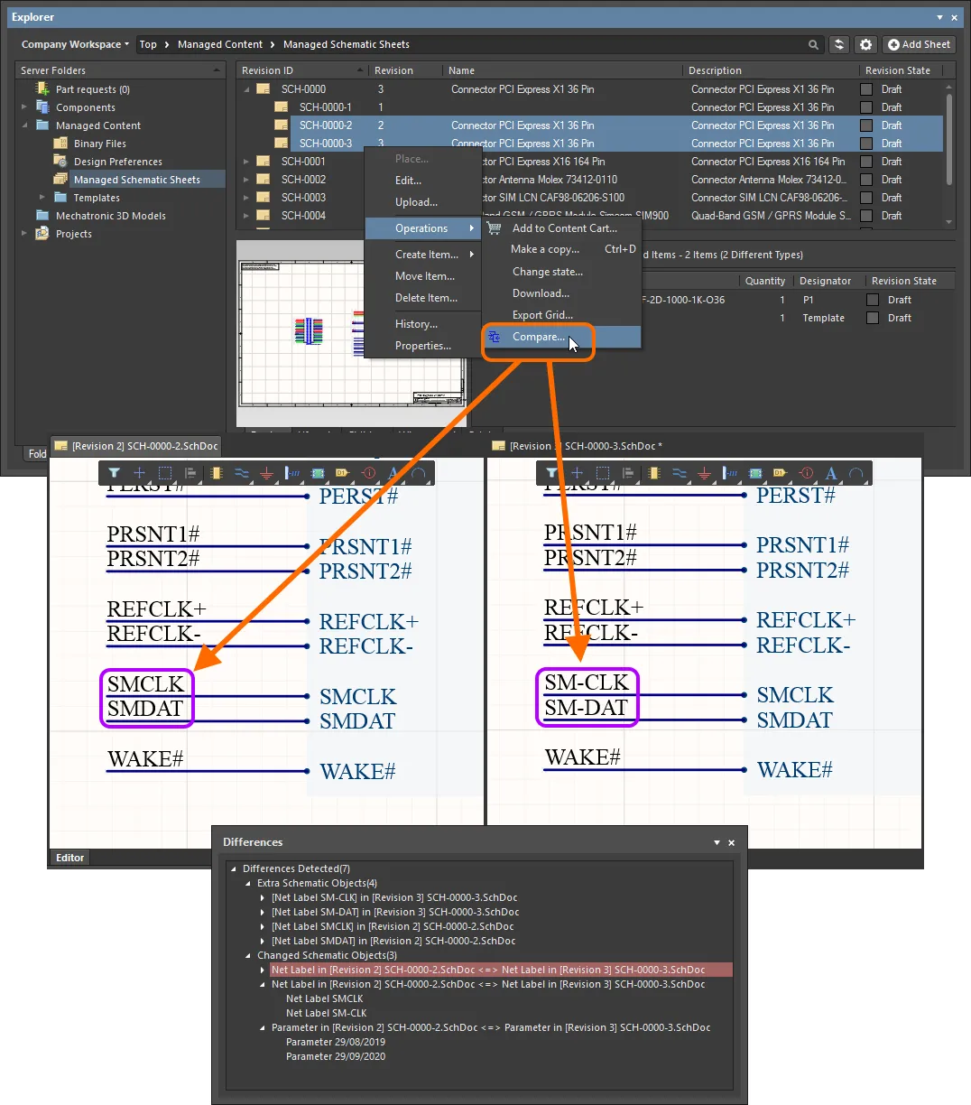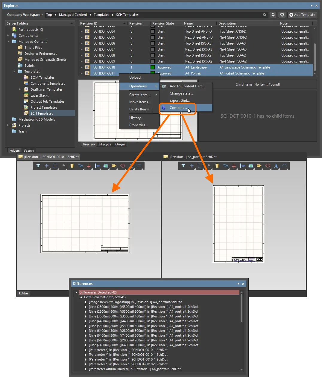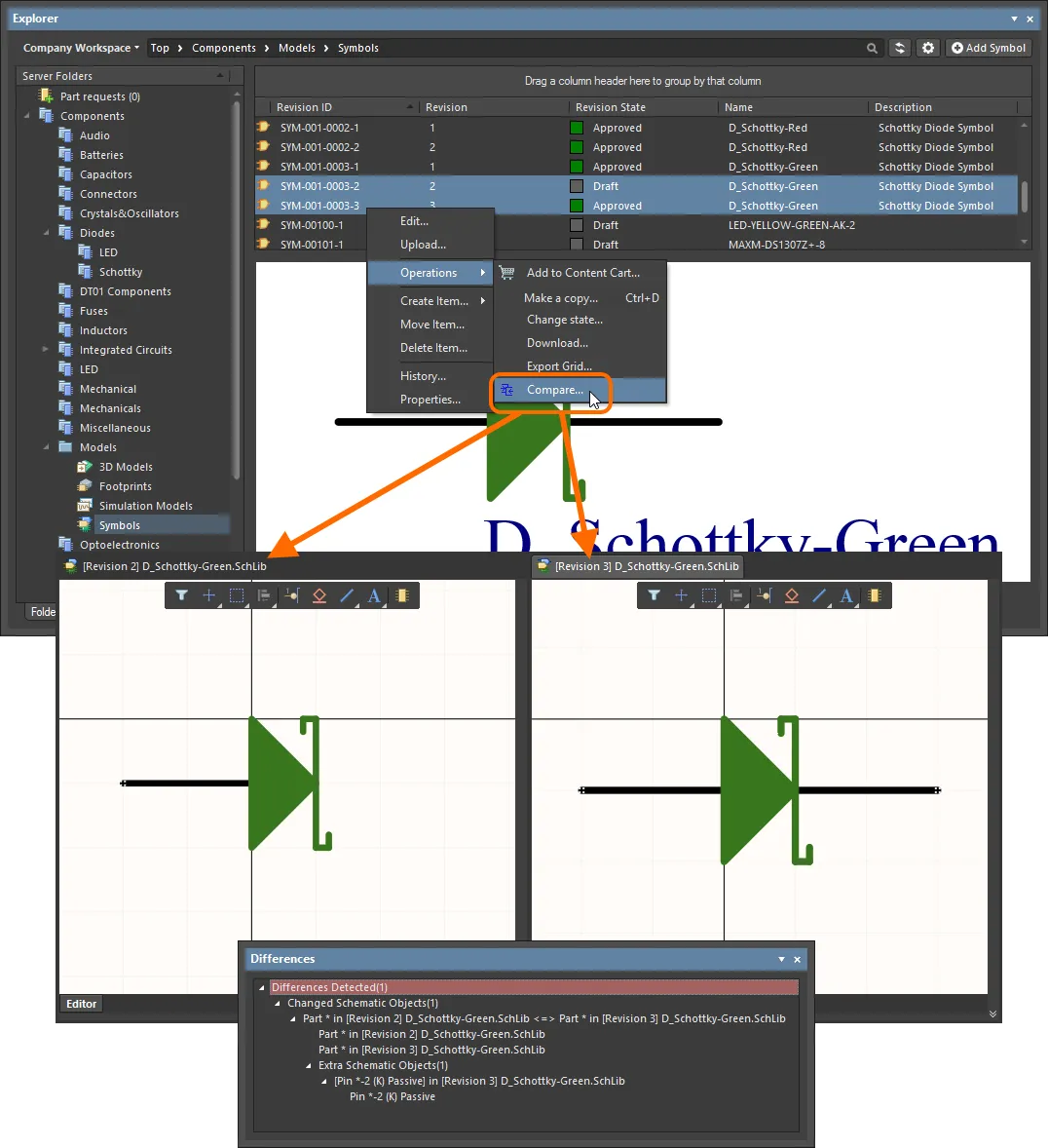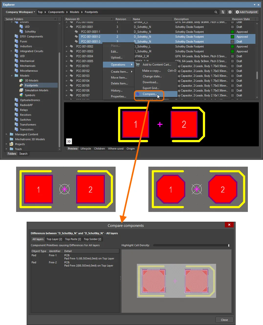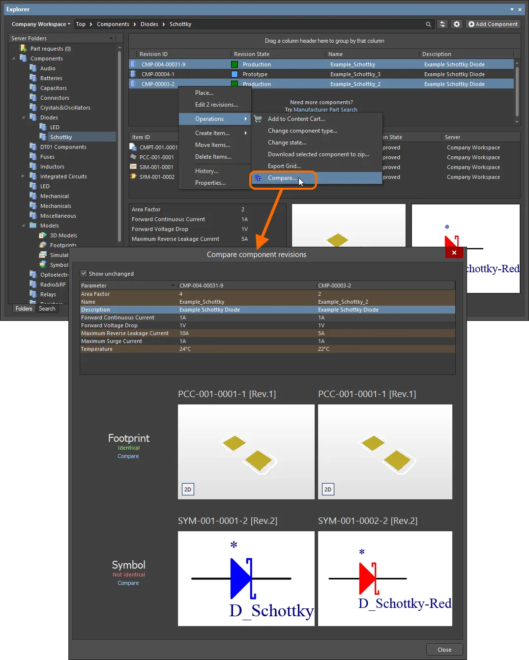 Using the power of Altium Designer's native file format comparison technology, the Workspace supports the visual comparison of two revisions – of the same, or different Items – for a range of supported content types, directly from within the Explorer panel. Revisions of Items of the following content types can be compared: