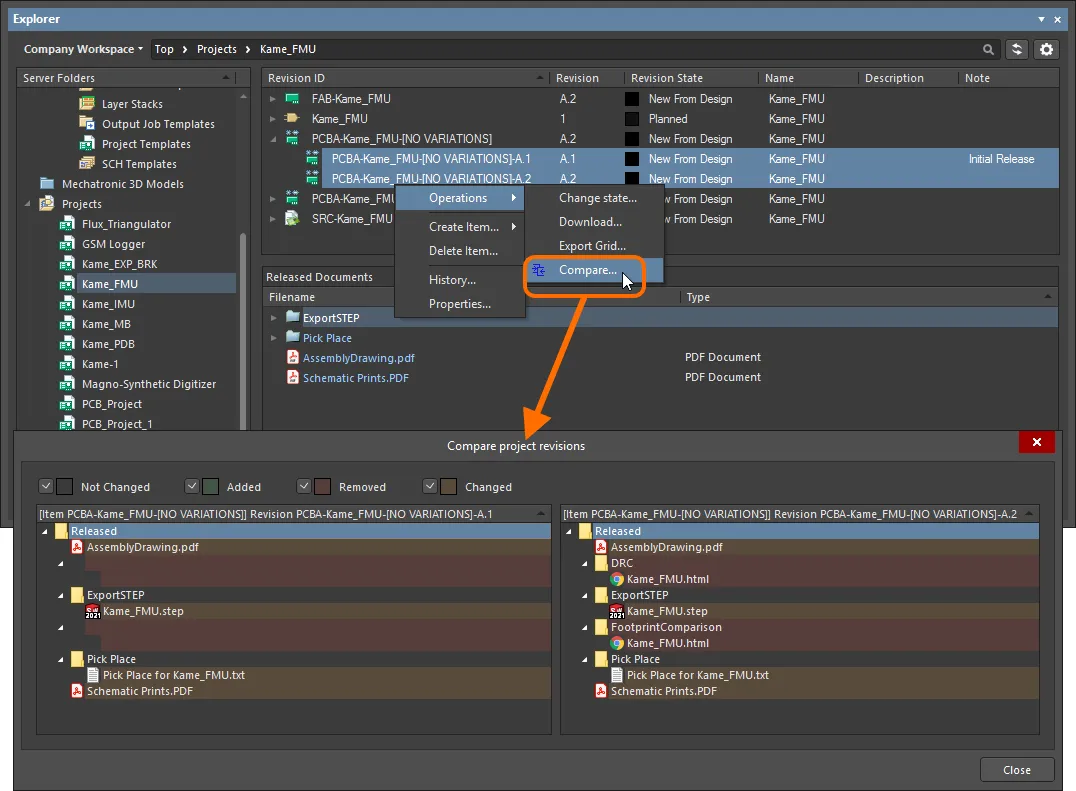 Within the Explorer panel, browse to the relevant folder, select the two Item-Revisions that you wish to compare, then right-click and choose Operations » Compare from the context menu.