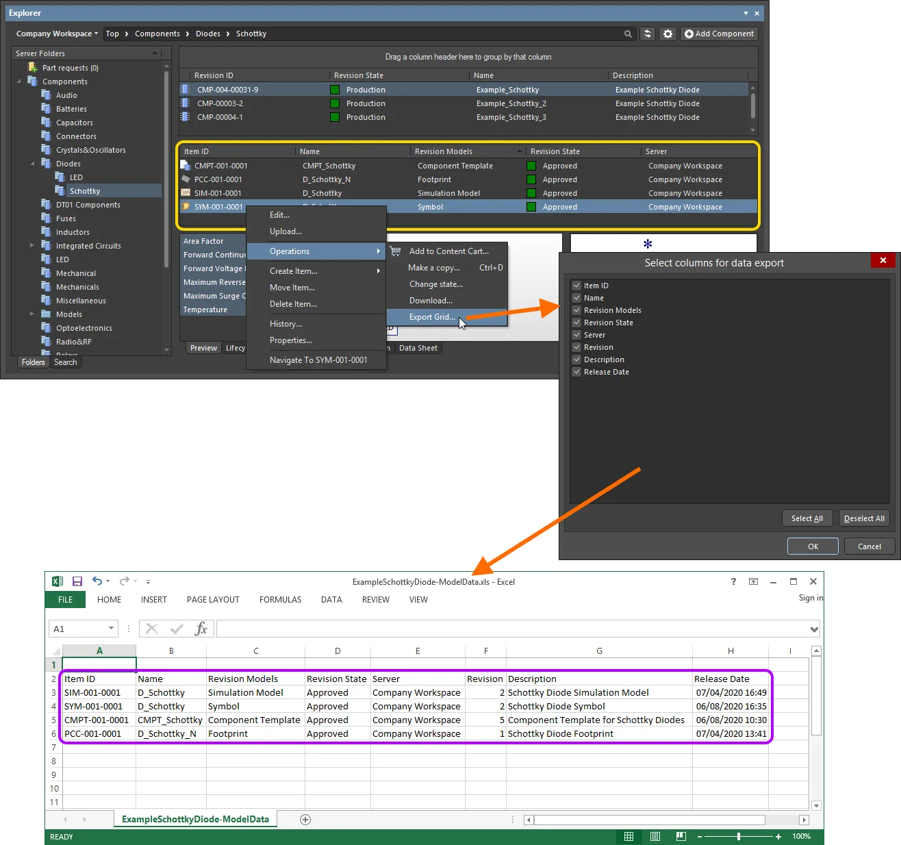 An example of exporting data – the linked models for a selected Component Item revision – to an Excel-formatted file.