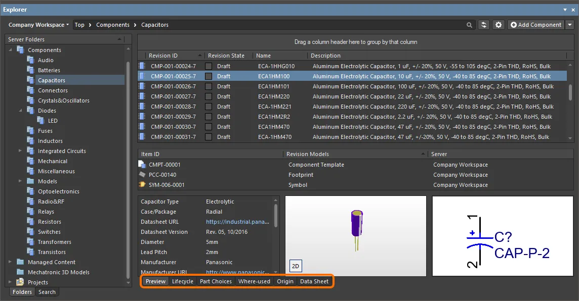 • Data Sheet – view or add file-based datasheets stored with the selected component.