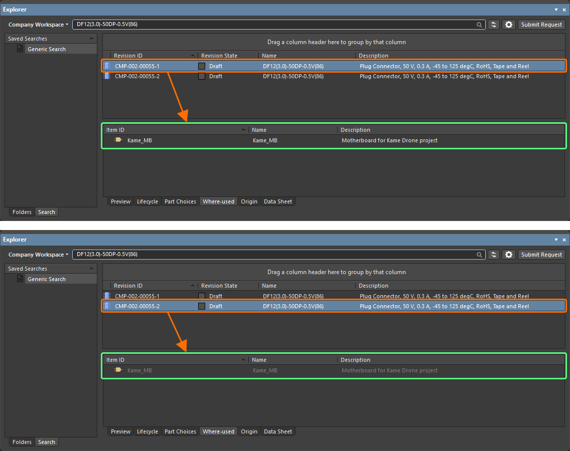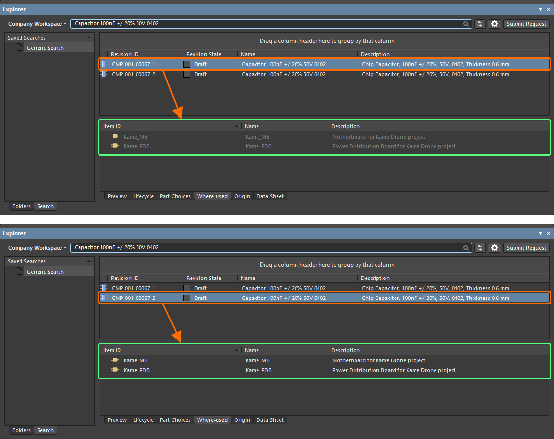 In this example, an older revision (revision 1) of a component is used in a project, so the project entry on the Where-used aspect view tab is highlighted when revision 1 of the component is selected but not for revision 2.