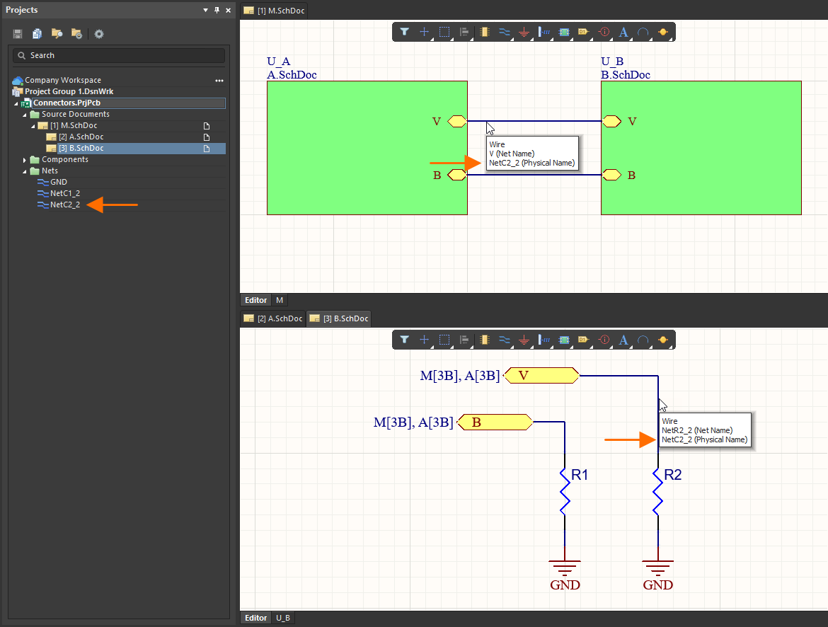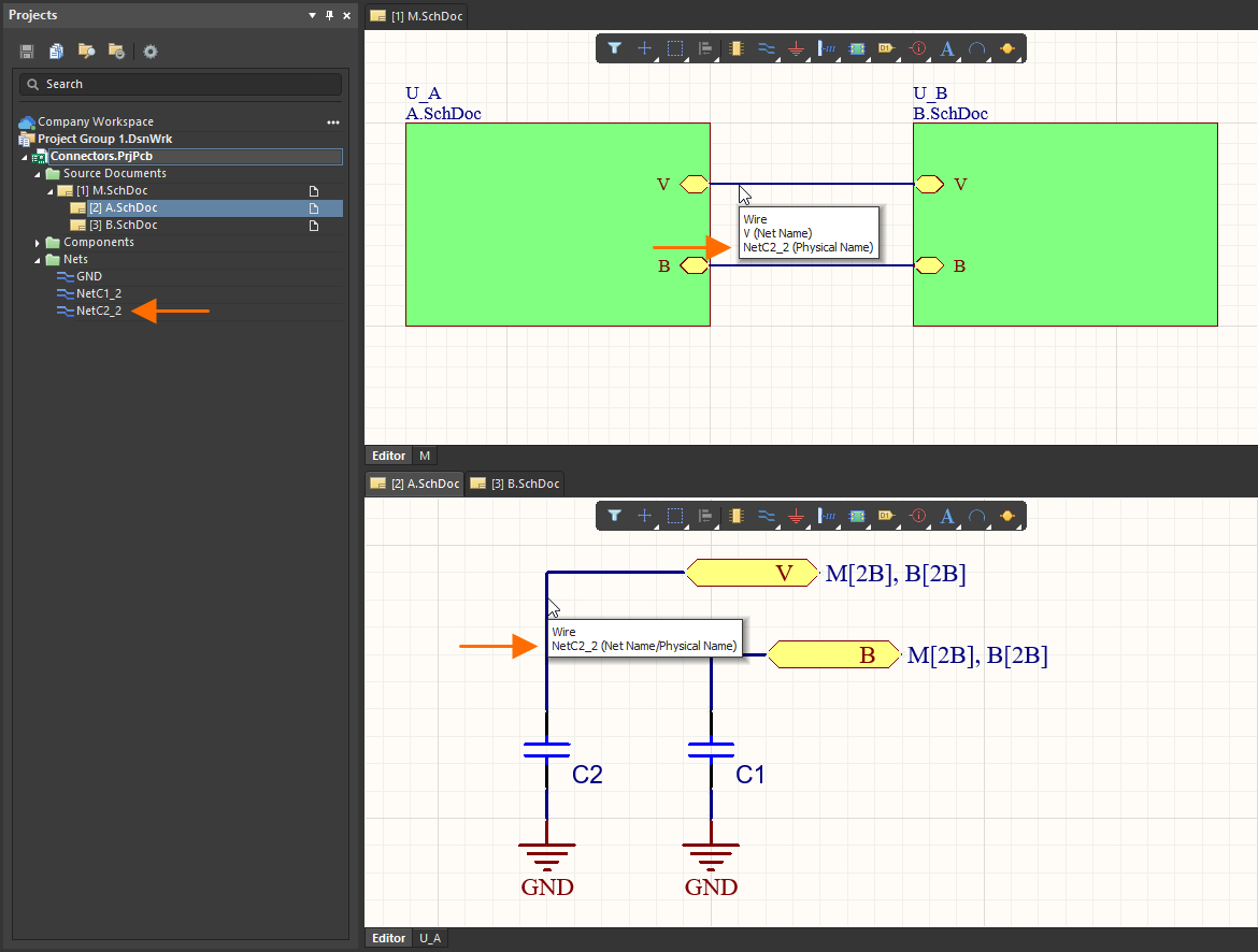 Both net name (logical) and physical name associated with a schematic wire are shown when the cursor is hovered over that wire. This particularly applies in hierarchical designs, where a net can have a name that is local to a schematic (a logical net name). The physical name of a net is its actual netlist assignment and that used for connectivity in the PCB.