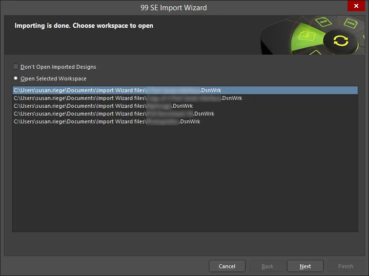 The import process has completed and you can choose whether to open the imported designs on this page. Select Open Selected Workspace, then choose from the listed designs to open a design space. If you do not want to open the imported designs, select Don't Open Imported Designs.