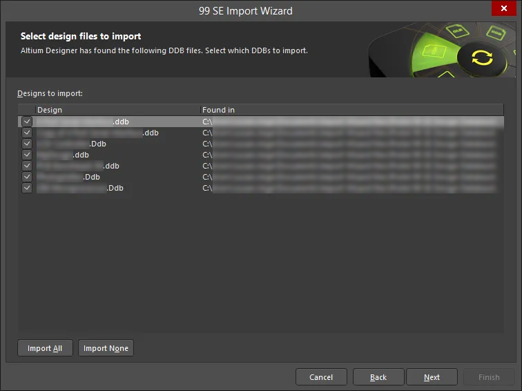 On this page of the Wizard, a list of DDB files appear that Altium Designer has found according to your import settings on previous pages of the Wizard. Enable the checkboxes of the design files you want to import. If you want to import all the displayed files, you also can click Import All to check all boxes. If you want to not import any of the listed files, click Import None to uncheck all boxes.
