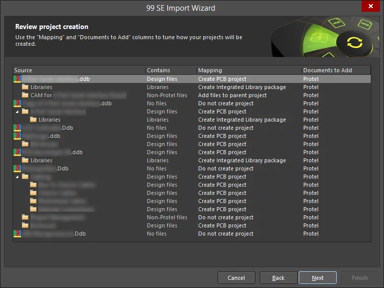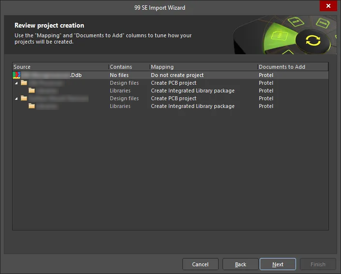 By default, objects from a 99 SE design database are mapped to the equivalent objects in Altium Designer as follows: a project group is created for the DDB, a PCB project for each folder that includes a PCB file, and a Library Package for each folder that only includes libraries. During import, you have the opportunity to change all of the mappings, except the DDB to project group.