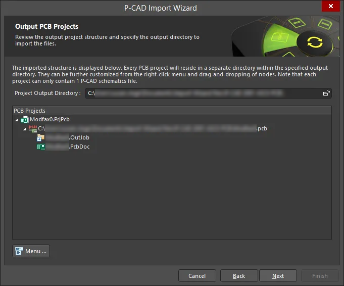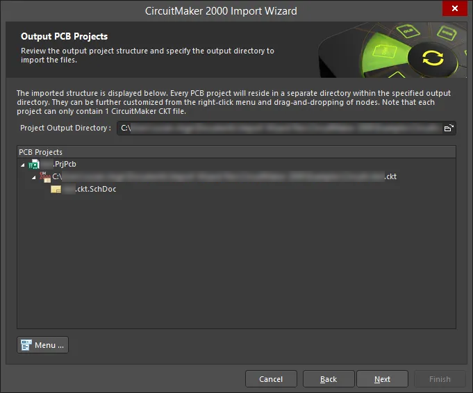Every PCB project will reside in a separate directory within a specified output directory. Note that each project can contain only one CircuitMaker .CKT file. Use this page of the Wizard to review the output project structure and specify the output directory in which to import the files. Use the Browse Folder icon to search for and choose the Project Output Directory.