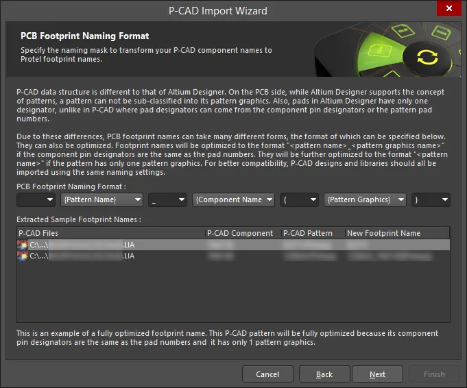 Use the drop-downs to select the PCB Footprint Naming Format. The Extracted Sample Footprint Names region dynamically updates according to your selections.