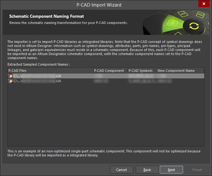 Use this page of the Wizard to review the schematic naming transformations for your P-CAD components. The P-CAD concept of symbol drawings does not exist in Altium Designer. Information such as symbol drawings, attributes, parts, pin names, pin/pad linkages, and gate/pin equivalencies must reside in a schematic component. As a result of this, each P-CAD component will be imported as an Altium Designer schematic component, with the schematic component names set to the P-CAD component names.