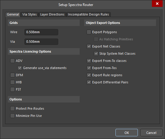 Whether exporting as part of an OutJob file, or directly from the File menu, you will be able to configure options for the export in the associated Setup Specctra Router dialog.