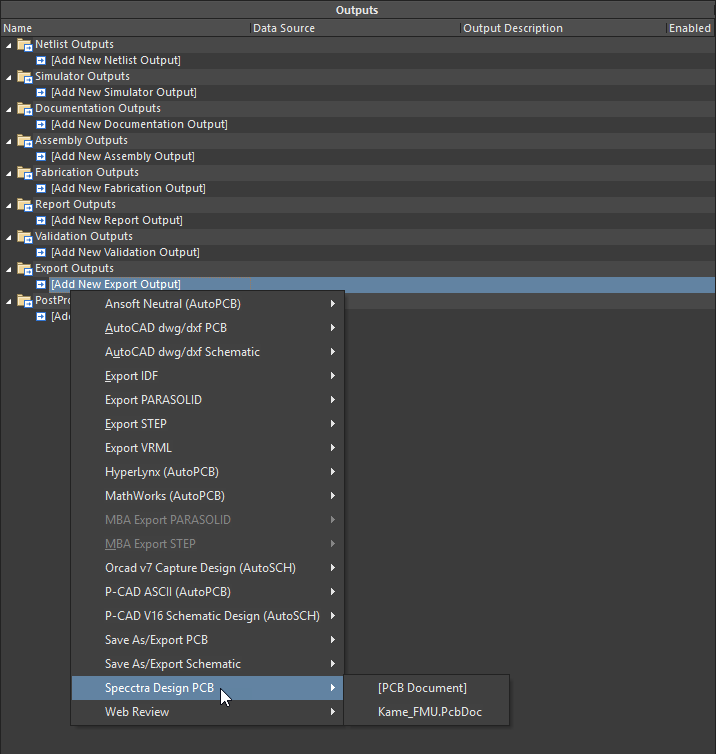 An Altium Designer PCB document can be exported to the Specctra design file format. In an Outputjob file, click [Add New Export Output] and select an entry in the Specctra Design PCB menu. The export outputs can then be generated directly from the file or as part of the Project Release process.