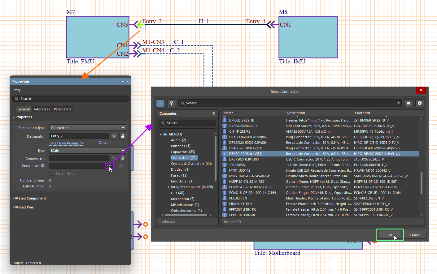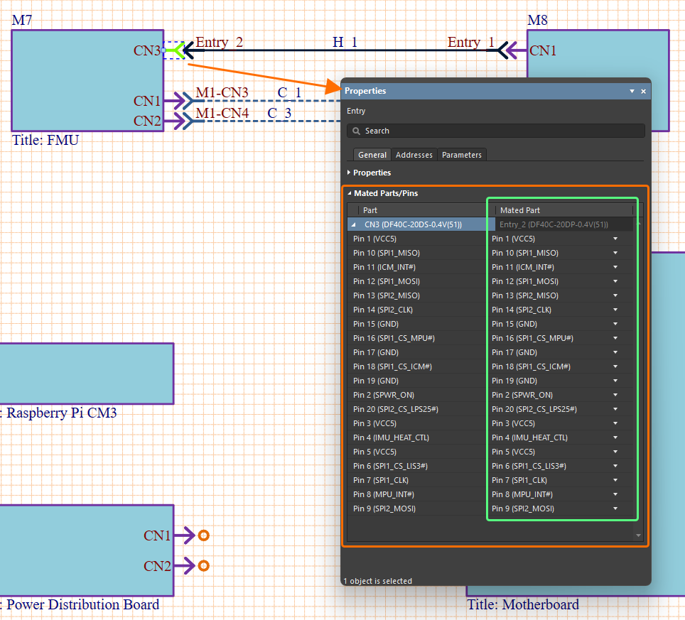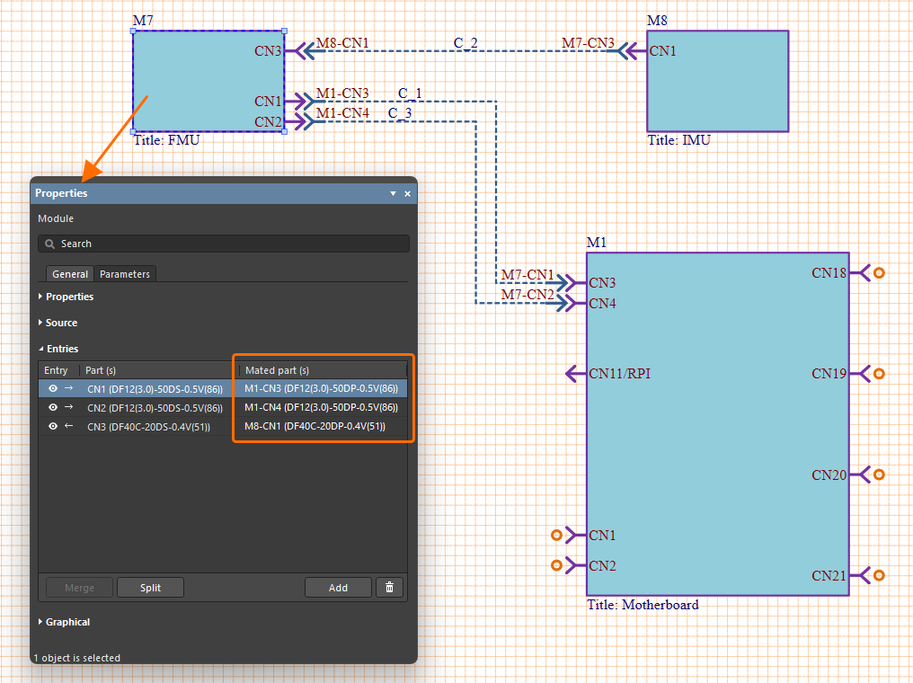 • Once a module entry is connected to another entry using a connection, the Mated part(s) column in the Entries region of the Properties panel when the module is selected lists the designators and names of the parts to which the entry is connected ().