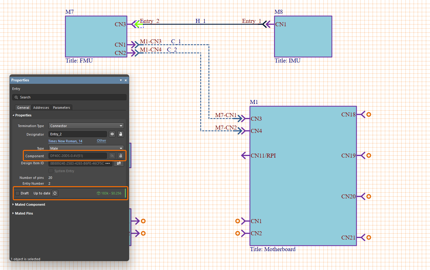 • A placed and terminated connection is automatically assigned a designator (C_1 in the example above) as an object identifier, which is editable in the connection's Properties panel. Its terminating ends are identified by their connection target information in the format <TargetModuleDesignator>-<TargetEntryDesignator>.