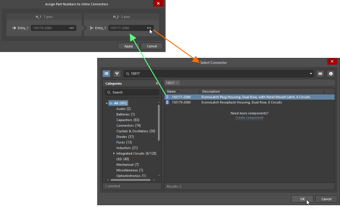 The Assign Part Numbers to Inline Connectors dialog opens in which you can select the required parts to use with the new entries. Click the associated  to select the desired connectors for each entry, then click Apply. This mates the two entries, and connection to one of the existing entries in each of the harness connections is automatically added.
