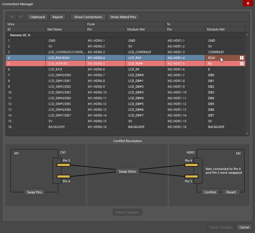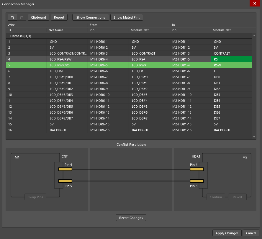 •  – the virtual wires that connect between HDR1 on M2 and HDR6 on M1 will be changed (swapped in this case) to correct the net connectivity conflict, and the connector pin/net assignments will not be changed. Here, wire 4 would then connect between pin 4 on HDR6 and pin 4 on HDR1, and wire 5 connect between pins HDR6-5 and HDR1-5.